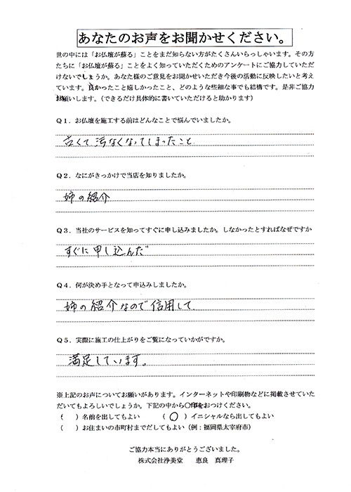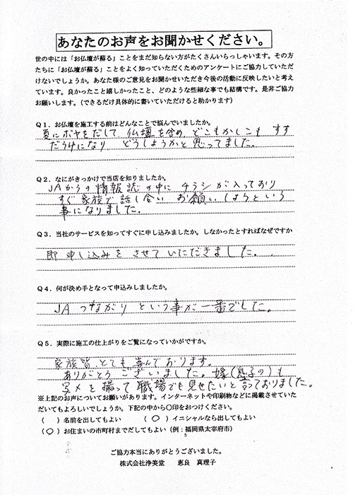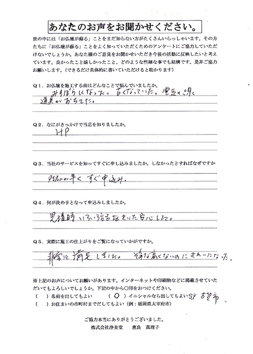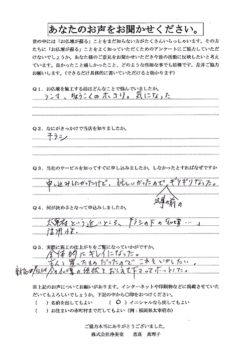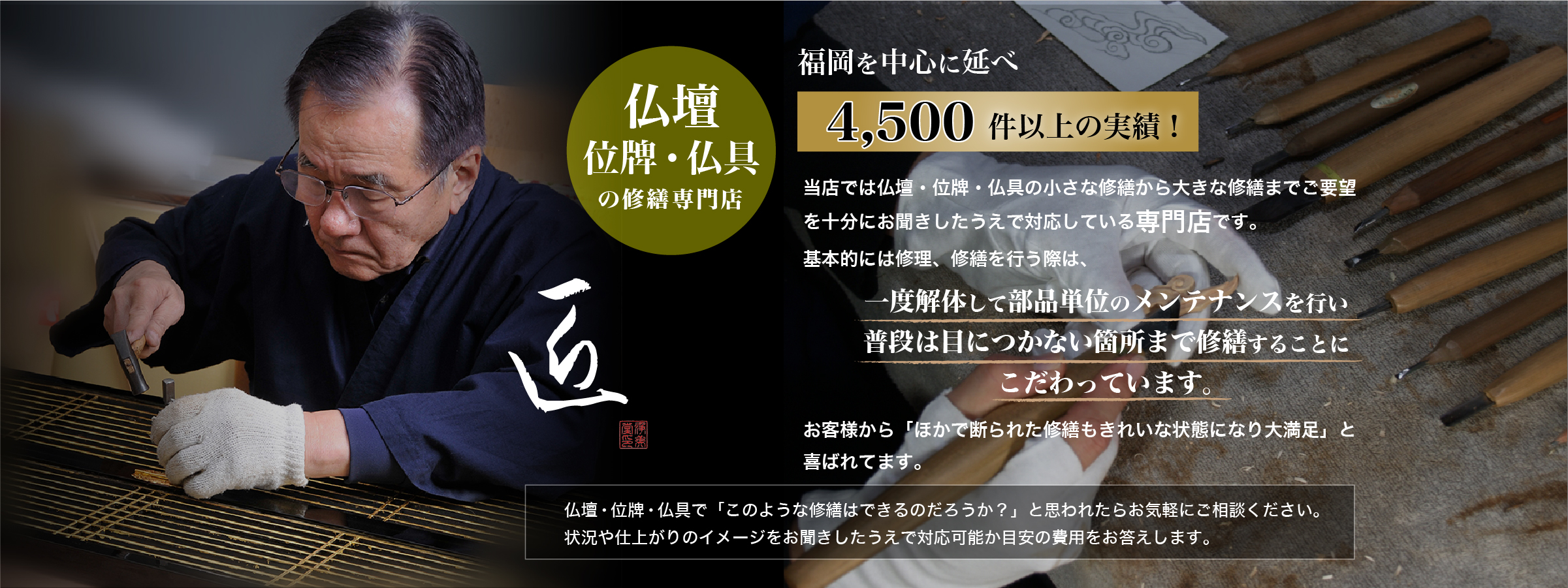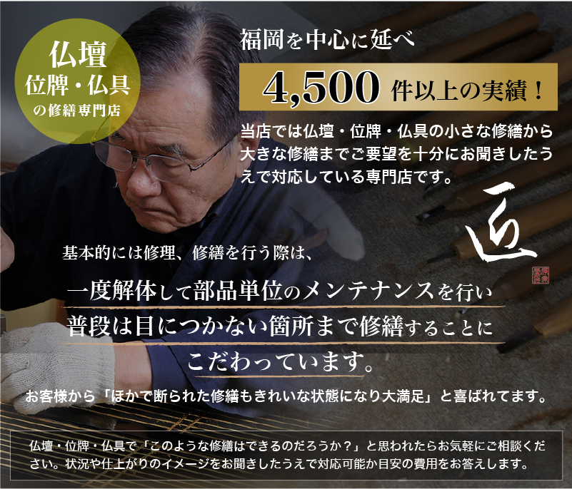 当店は福岡中心に仏壇・位牌・仏具メンテナンスの草分けとして、個人のお客様からお寺様、神社様まで延べ4,500件以上の施工をさせていただきました。状態やニーズをじっくりヒアリングのうえでご対応させていただきます。